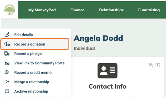 To record a donation, choose Finance > Record a Donation from the main menu.