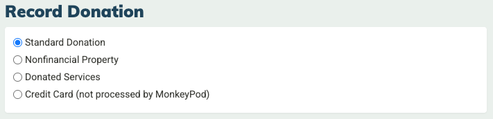 - Standard Donation: This is what we typically think of when we talk about donations. Choose this option for donations made by cash or check or credit card donations to be processed by MonkeyPod. (For credit cards previously processed elsewhere, see below.)