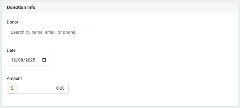 Every donation requires you to enter the basic donor information: the donor name, the date of the donation, and the amount/value of the gift.