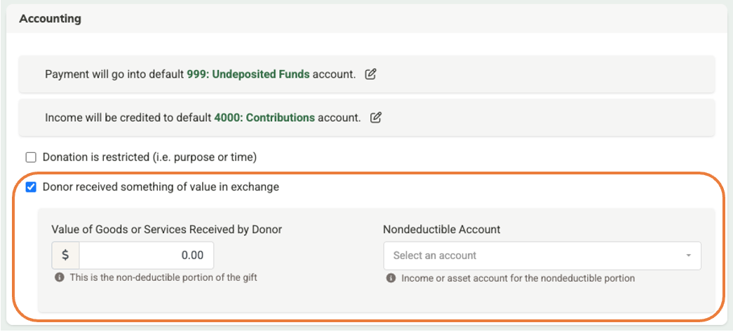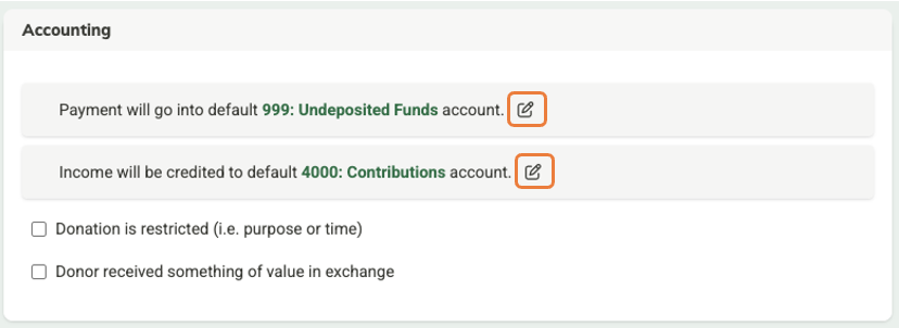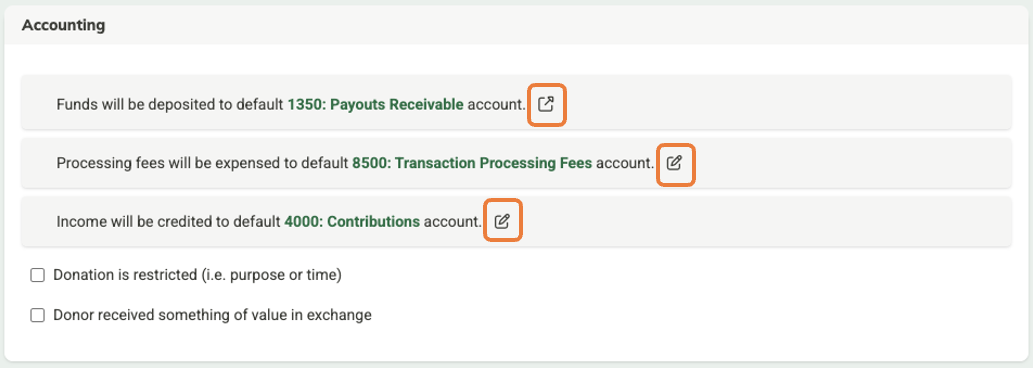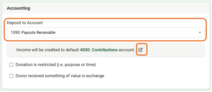 The funds will be recorded as deposited to your default payouts receivable account, processing fees will be expensed to your default transaction processing fees account, and income will be credited to the default contributions account. Edit any of the accounts to use for this donation by selecting the corresponding edit icon.
