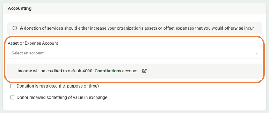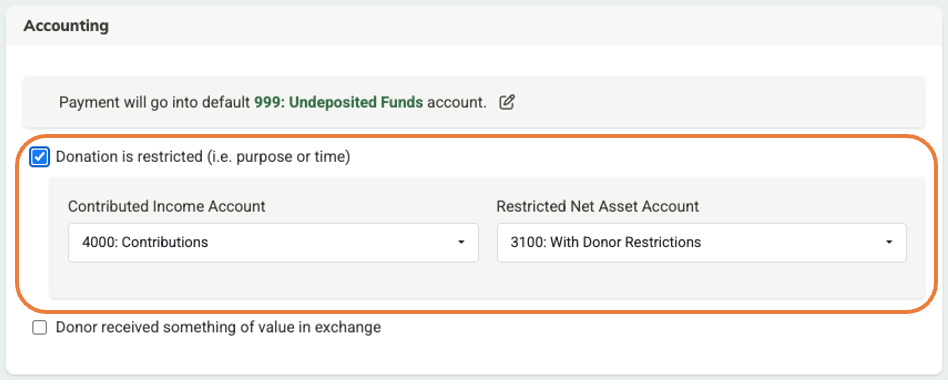 To record these restrictions for any donation type, select the Donation is restricted (i.e. purpose or time) checkbox in the Accounting section. That will expand the options for account selection to include a restricted net asset account along with the contributed income account to be used for the donation.