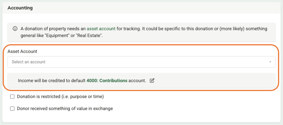 The accounting is different in that a donation of property needs an asset account for tracking. The asset account could be specific to this donation or (more likely) something general like "Equipment" or "Real Estate". Select the asset account in the Accounting section, along with the income account that should be credited.