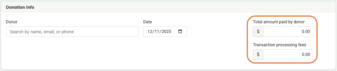 When recording credit card transactions previously processed outside of your MonkeyPod, you'll have the option to record any transaction processing fees related to the donation. Be sure to enter the full value of the donation in the Total paid by donor field—do not subtract the processing fees here. Then enter the fees paid in the Transaction processing fees field. For the accounting, the processing fees will automatically debit the default transaction processing fees account.