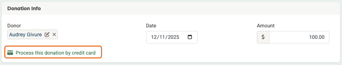 When manually recording a credit card donation, enter the donor name, date, and amount as described above. After you enter the amount, you will see a new option appear to Process this donation by credit card. Select that link to enter the credit card details.