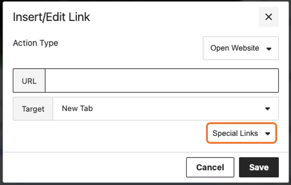 There's not a merge tag, but you can include a link to a MonkeyPod fundraising page by using the "Special Links" option when writing the content of your campaign. In the Content tab for the campaign, select the text you would like to turn into a link to the fundraising page. Next, choose the link icon from the formatting palette. In the link dialog, choose Special Links and select your fundraising page.