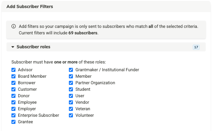 By default, all roles will be selected. Select the role(s) you want to include. You may choose just the specific roles to target, but at least one role is required. (If the role doesn't matter because you are further segmenting on something else, just keep all the roles selected.)