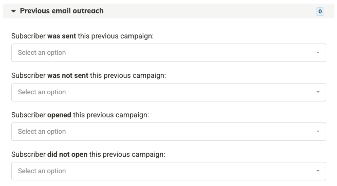 You may also narrow your segment based on whether or not the recipient opened a previous campaign, or whether or not they were sent a previous campaign.