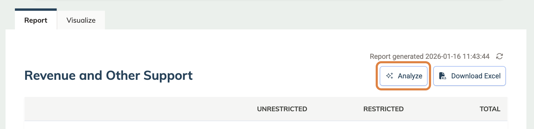 The Analyze button at the top of the Statement of Activities uses AI to surface helpful insights from your financial data, drawing on industry benchmarks from public sources for context. It generates a concise financial performance briefing that summarizes your organization’s current position, highlights potential concerns, flags future considerations, and offers strategic recommendations.