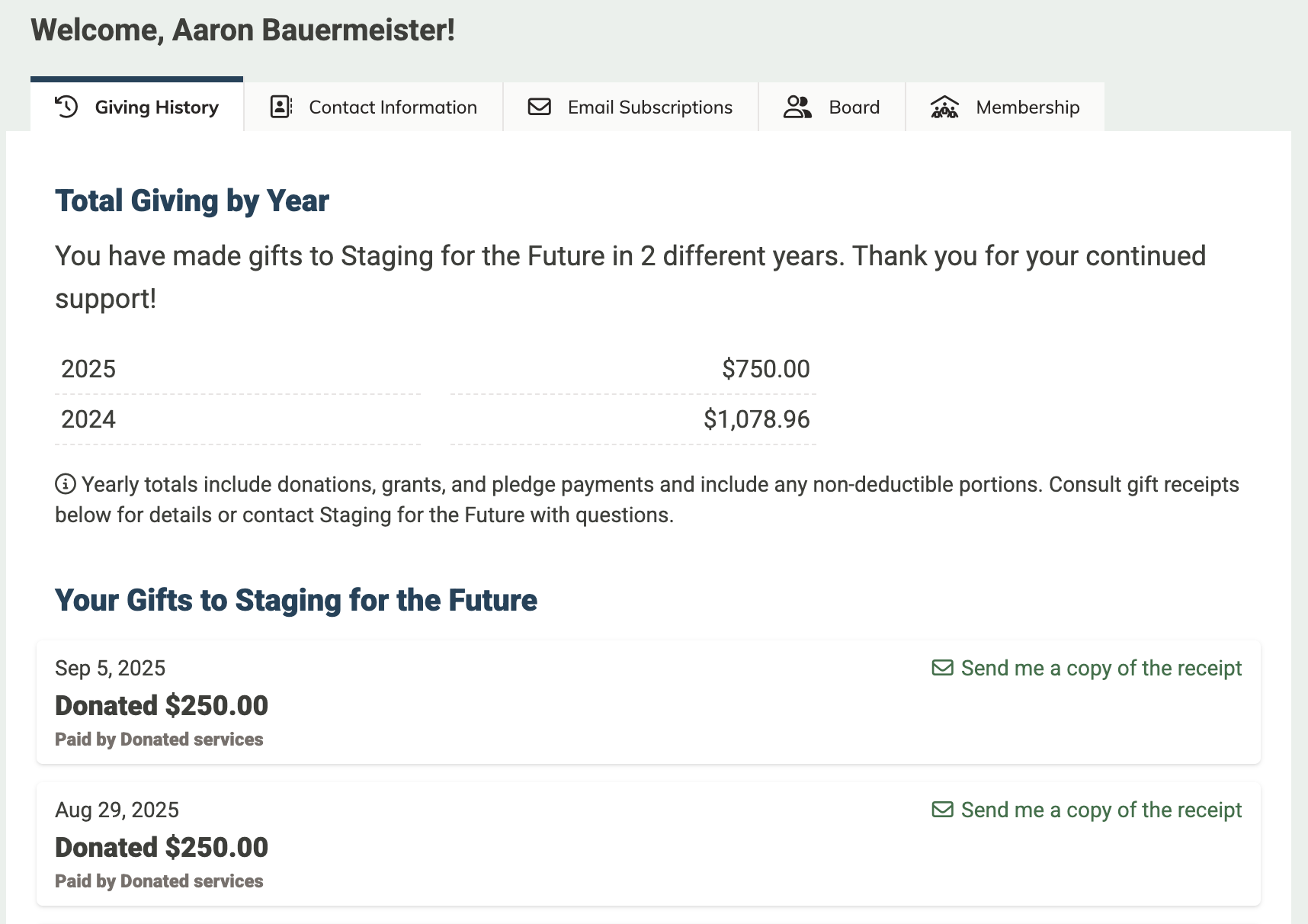 Once logged in, their portal displays their giving history, contact information, email subscriptions and (if relevant) a tab for board involvement (from Board HQ) and/or membership details (from Member HQ). Their yearly giving totals are also listed. These totals include donations, grants and pledge payments—including non-deductible portions of those gifts. Individual gift receipts have the details about any non-deductible amounts, and those can be resent from this screen.