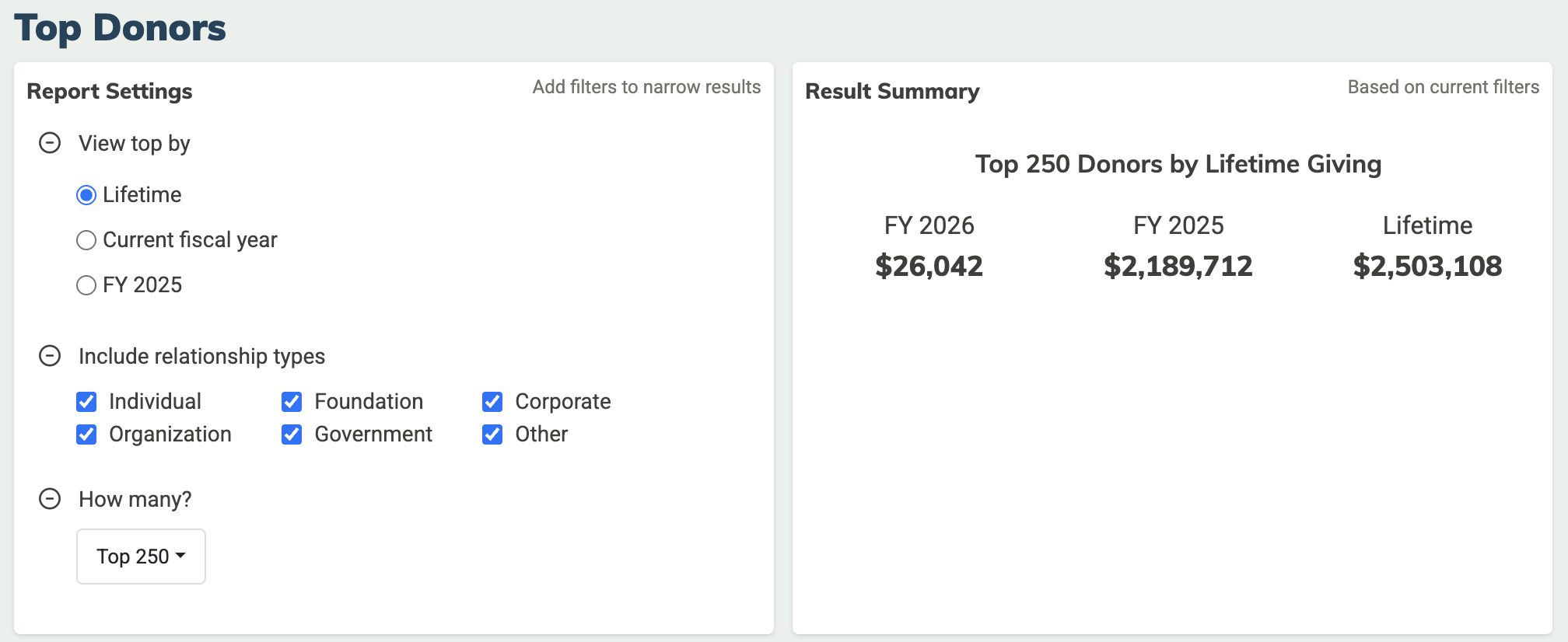 Filters and summary data at the top of the report enable you to focus on specific timespans, certain types of donors (by relationship type), and choose how many to include in your report.