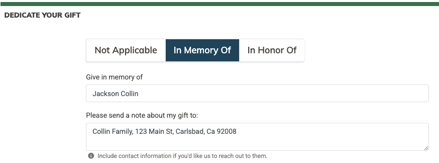 When submitting a donation through a MonkeyPod fundraising page or embed, donors can enter the name of the person to memorialize and include information about the donation—such as where to send an note to let a family member know about the gift.