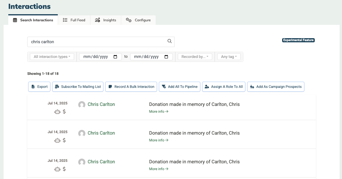 Another approach is to use the Interactions Feed. Choose Relationships > Interactions from the main menu, and then search for the name of the memorialized individual. You should find all donations made in their name. This list can also be filtered by interaction type, date range, or tag.