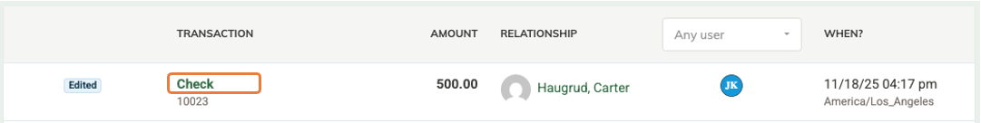 The audit log shows you that a transaction was changed in some form, indicated by the label in the first column (e.g. Created, Edited, Deleted). To see more detail about the edits made to a transaction, click the transaction in the audit log.