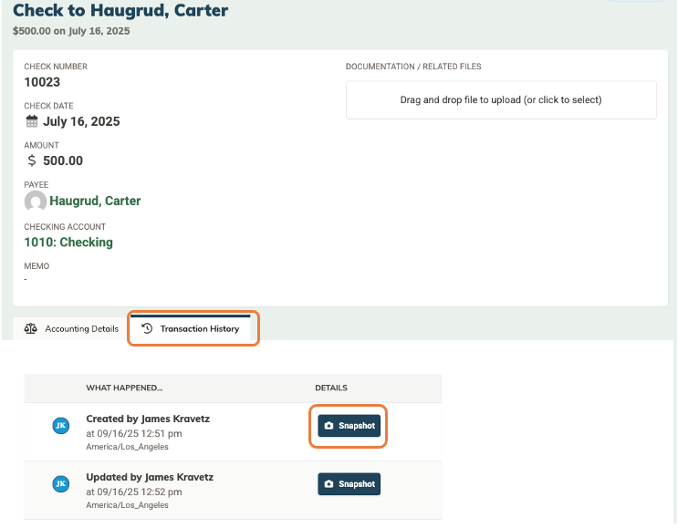 That will open the page for that transaction in your MonkeyPod. Select the Transaction History tab at the bottom to view the timeline of changes to that transaction. Click the Snapshot button to view the details of any particular change.
