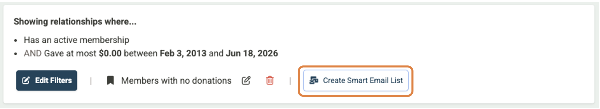 When a relationship no longer matches your search criteria, they are unsubscribed from the Smart Email List automatically. However, if they later match the criteria again—say, they renew a lapsed membership or make a new donation—they'll be resubscribed automatically as well. Manual unsubscribes and "do not email" preferences are always respected and will not be overridden.